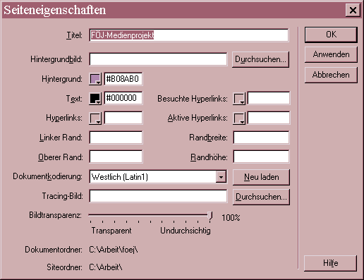 Seiteneigenschaften gewisse Grundeinstellungen vorgenommen werden, wie