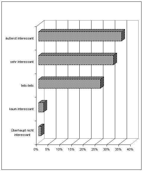 4.2 Veranstaltungen Im Rahmen der Befragung zu den Veranstaltungen wurden bei sechs Vorträgen der Veranstaltungsreihe „Der Kunstgarten" insgesamt 79 Personen befragt. Da diese Personen speziell für dieses Angebot in die Stadtbücherei kamen, war davon auszugehen, dass bei diesen Besucher/innen ein großer Bezug zu kunstbezogenen Angeboten der Stadtbücherei vorhanden ist. Bezogen auf die Veranstaltungen waren vor allem das Veranstaltungsprogramm (33%), Hinweise in der Zeitung (25%) und Hinweise durch Bekannte (18%) die „Medien", welche die Besucher/innen auf das Angebot aufmerksam gemacht haben; die spezielle Einladungskarte war dies immerhin noch für 9%. Die Motivationen Ausstellungsangebote zu nutzen sind bei den Befragten unterschiedlich. Das Interesse am Thema überwiegt hier bei der Motivation: Für 84% (bei 86% Beantwortung der Frage) trifft dies „teilweise" bis „voll und ganz" zu. Das Informationsinteresse schlägt noch mit 52% (bei 59% Beantwortung der Frage) zu Buche und Neues erfahren zu wollen mit 61% (bei 66% Beantwortung der Frage). Damit treffen diese drei Motivationen bei ca. 90% der Personen, die geantwortet haben zu. Mit Menschen in Kontakt zu kommen (14% bei 51% Beantwortung) und zu entspannen (19% bei 54% Beantwortung) spielen hier ebenfalls kaum eine Rolle. Auffallend ist bei der Befragung der Besucher/innen der Veranstaltungen, dass die über 40-jährigen mit 65% sehr stark vertreten sind. Bei der Nutzerbefragung im Frühjahr 2000 hat sich gezeigt, dass nur 15,5% der Nutzer/innen über 45 Jahre alt sind. Auch hier wird von den Befragten – wie zu erwarten – die Bedeutung von Kunst in der Stadtbücherei sehr hoch eingeschätzt, dies hat sich in unterschiedlichen Einschätzungen gezeigt. Der folgenden Aussage haben 83% „teilweise" bis „voll und ganz" zugestimmt.