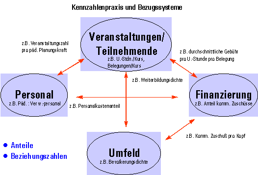 - Es ist nicht zu erwarten, daß komplexe Sachverhalte im Bildungsbereich durch Primitivformen von quantitativen Beschreibungssystemen (einfache Beziehungszahlen, Anteile) adäquat erfaßt werden. Beispiel: Die Gesamtunterrichtsstundenzahl einer VHS pro hauptberuflich pädagogische Planungskraft (WBG NW 1975) beschreibt die Relation von Personalressourcen zu Leistungsmerkmalen nur unzureichend. Mehrdimensionale Kennzahlensysteme (z.B. vierdimensionales Bezugssystem zu Veranstaltungen, Unterrichtsstunden, Belegungen und Kursleiter) können Verbesserungen bringen.